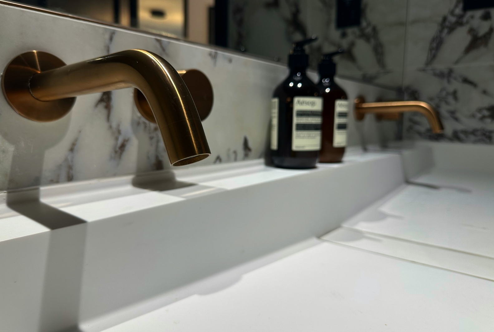 Renovation of both bathrooms, featuring clean architectural lines, brushed brass fittings, and walk-in showers